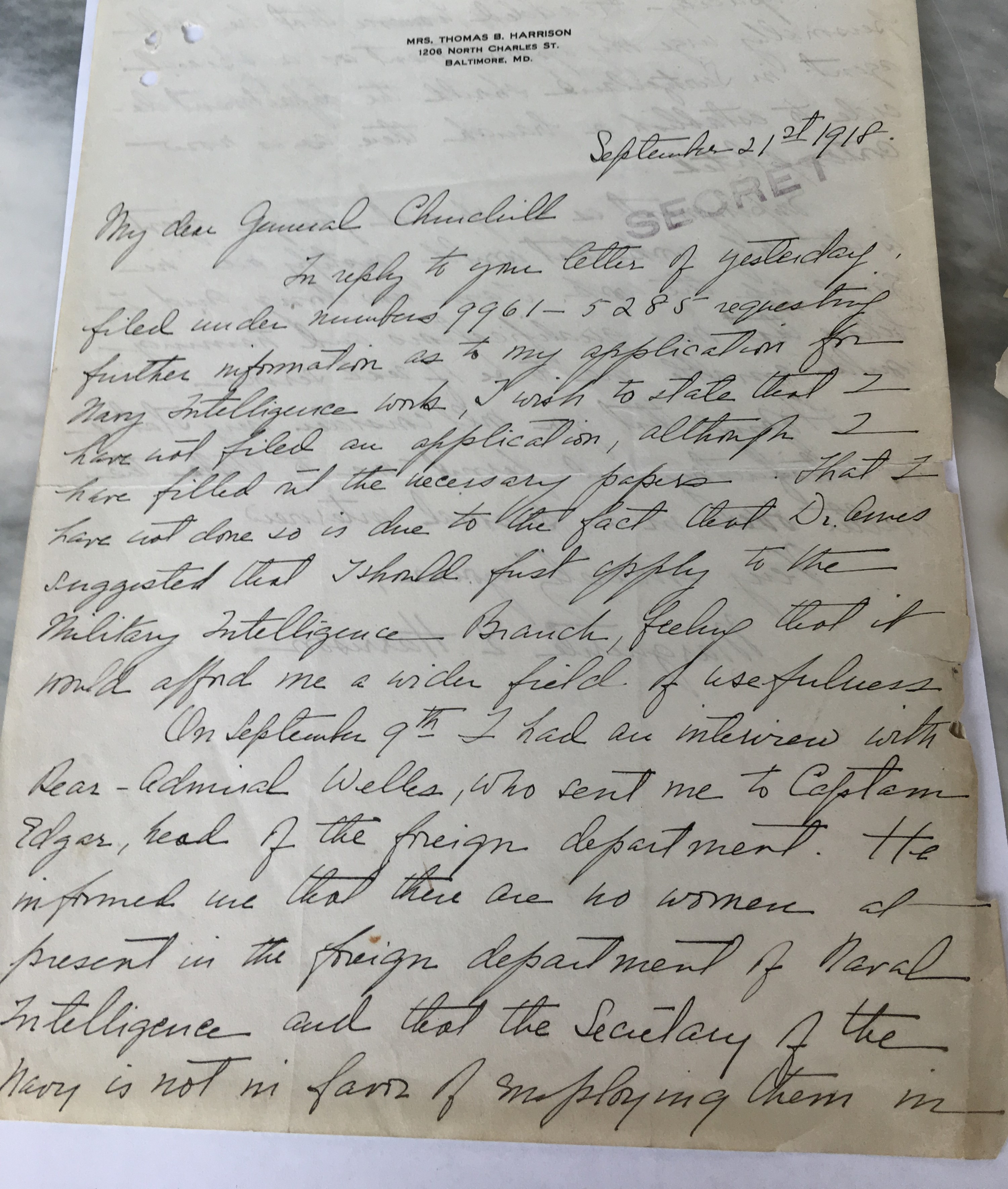 Sept. 21, 1918– World War I was nearing its end when Marguerite Harrison, a 39-year-old music and theater reviewer for the Baltimore Sun, wrote to Military Intelligence Division Director Marlborough Churchill asking for a job with the spy service. “Employment as a special foreign agent is the only work that would justify me in giving up the work I am now doing, and I believe my qualifications and training would enable me to be of real service,” she told him.